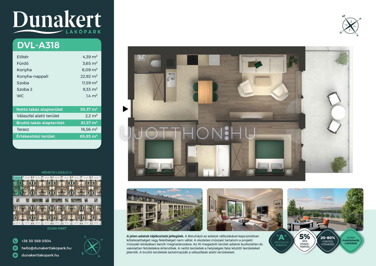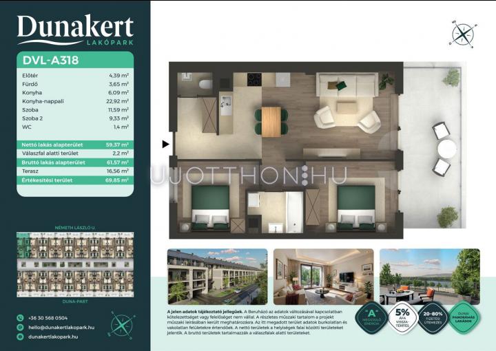 A Dunakert Lakópark Vác északi részén, a Németh László utcában épül, egy csendes, rendezett városrészben, közvetlenül a Duna-part mellett. A négyszintes épületben 152 modern, energiahatékony lakás kap helyet. A praktikus stúdióktól a nappali + több hálószobás családi otthonokig. Az emeleti lakásokhoz tágas terasz, a földszintiekhez saját kert tartozik, így minden lakó számára biztosított a privát kültéri tér és a természetkapcsolat.