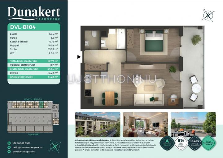 A Dunakert Lakópark Vác északi részén, a Németh László utcában épül, egy csendes, rendezett városrészben, közvetlenül a Duna-part mellett. A négyszintes épületben 152 modern, energiahatékony lakás kap helyet. A praktikus stúdióktól a nappali + több hálószobás családi otthonokig. Az emeleti lakásokhoz tágas terasz, a földszintiekhez saját kert tartozik, így minden lakó számára biztosított a privát kültéri tér és a természetkapcsolat.
