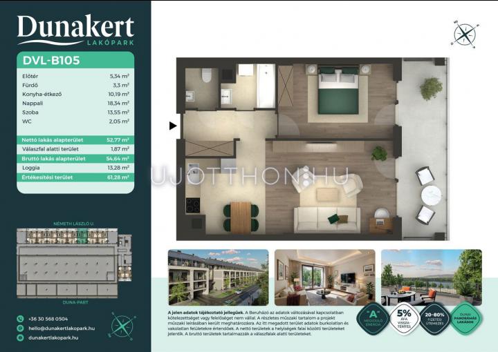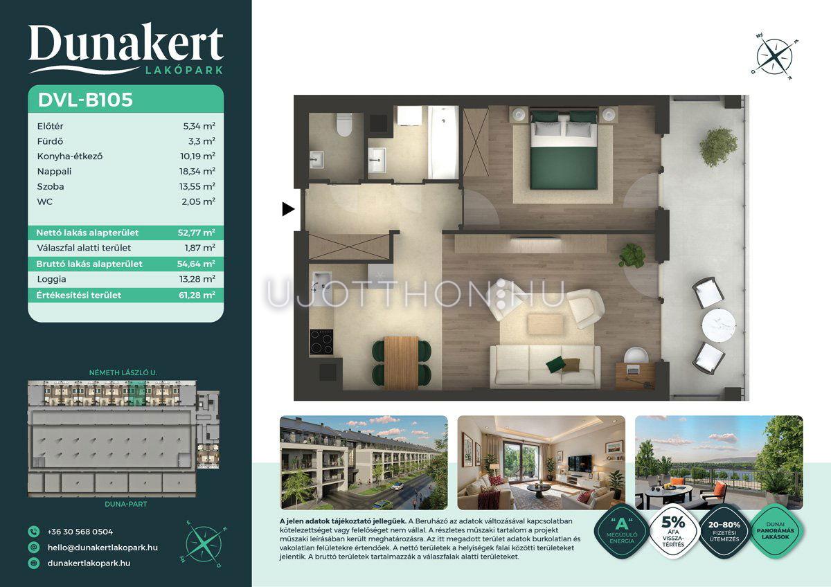 A Dunakert Lakópark Vác északi részén, a Németh László utcában épül, egy csendes, rendezett városrészben, közvetlenül a Duna-part mellett. A négyszintes épületben 152 modern, energiahatékony lakás kap helyet. A praktikus stúdióktól a nappali + több hálószobás családi otthonokig. Az emeleti lakásokhoz tágas terasz, a földszintiekhez saját kert tartozik, így minden lakó számára biztosított a privát kültéri tér és a természetkapcsolat.