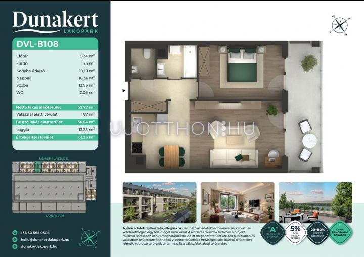 A Dunakert Lakópark Vác északi részén, a Németh László utcában épül, egy csendes, rendezett városrészben, közvetlenül a Duna-part mellett. A négyszintes épületben 152 modern, energiahatékony lakás kap helyet. A praktikus stúdióktól a nappali + több hálószobás családi otthonokig. Az emeleti lakásokhoz tágas terasz, a földszintiekhez saját kert tartozik, így minden lakó számára biztosított a privát kültéri tér és a természetkapcsolat.