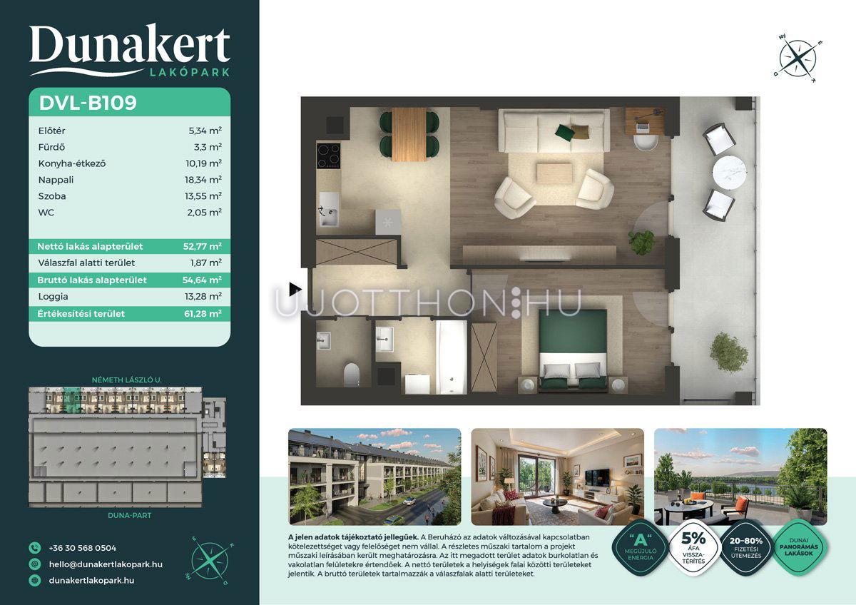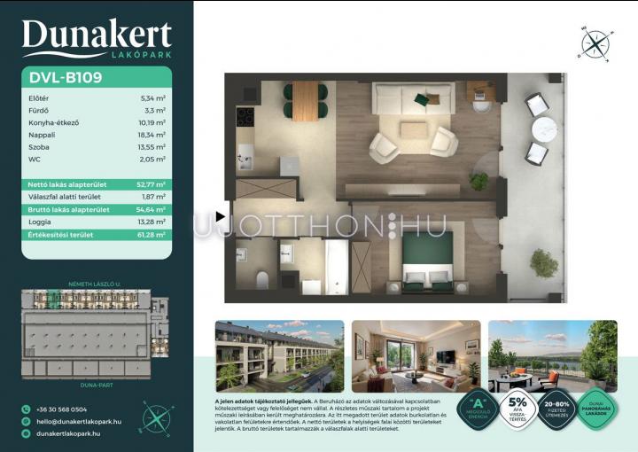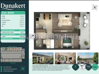 A Dunakert Lakópark Vác északi részén, a Németh László utcában épül, egy csendes, rendezett városrészben, közvetlenül a Duna-part mellett. A négyszintes épületben 152 modern, energiahatékony lakás kap helyet. A praktikus stúdióktól a nappali + több hálószobás családi otthonokig. Az emeleti lakásokhoz tágas terasz, a földszintiekhez saját kert tartozik, így minden lakó számára biztosított a privát kültéri tér és a természetkapcsolat.