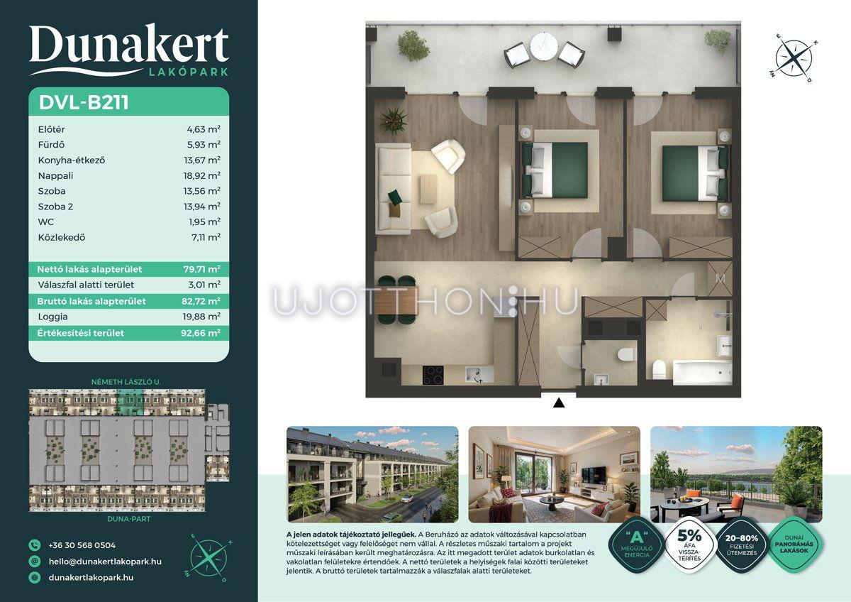 A Dunakert Lakópark Vác északi részén, a Németh László utcában épül, egy csendes, rendezett városrészben, közvetlenül a Duna-part mellett. A négyszintes épületben 152 modern, energiahatékony lakás kap helyet. A praktikus stúdióktól a nappali + több hálószobás családi otthonokig. Az emeleti lakásokhoz tágas terasz, a földszintiekhez saját kert tartozik, így minden lakó számára biztosított a privát kültéri tér és a természetkapcsolat.