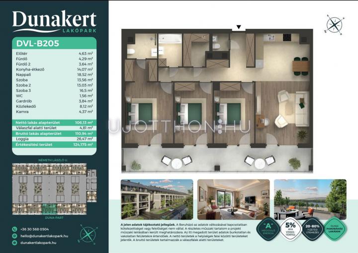A Dunakert Lakópark Vác északi részén, a Németh László utcában épül, egy csendes, rendezett városrészben, közvetlenül a Duna-part mellett. A négyszintes épületben 152 modern, energiahatékony lakás kap helyet. A praktikus stúdióktól a nappali + több hálószobás családi otthonokig. Az emeleti lakásokhoz tágas terasz, a földszintiekhez saját kert tartozik, így minden lakó számára biztosított a privát kültéri tér és a természetkapcsolat.
