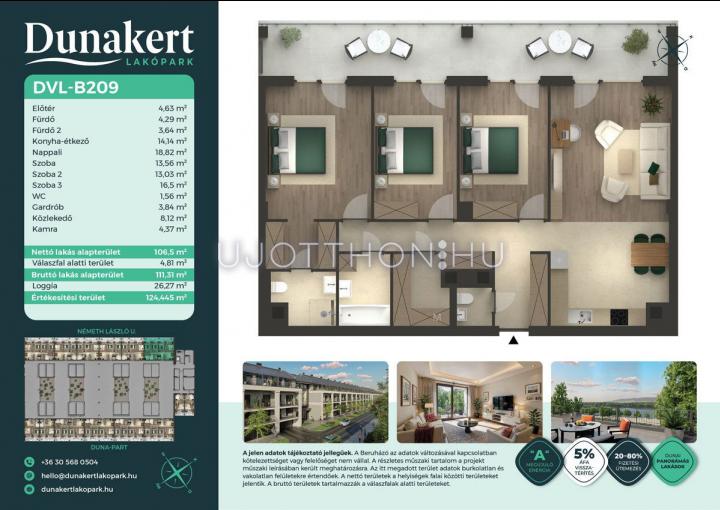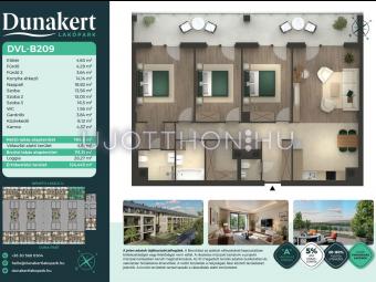 A Dunakert Lakópark Vác északi részén, a Németh László utcában épül, egy csendes, rendezett városrészben, közvetlenül a Duna-part mellett. A négyszintes épületben 152 modern, energiahatékony lakás kap helyet. A praktikus stúdióktól a nappali + több hálószobás családi otthonokig. Az emeleti lakásokhoz tágas terasz, a földszintiekhez saját kert tartozik, így minden lakó számára biztosított a privát kültéri tér és a természetkapcsolat.