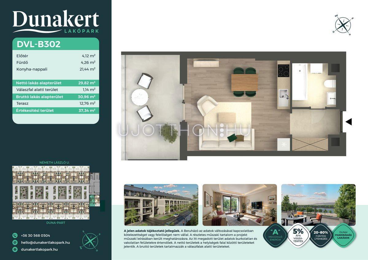 A Dunakert Lakópark Vác északi részén, a Németh László utcában épül, egy csendes, rendezett városrészben, közvetlenül a Duna-part mellett. A négyszintes épületben 152 modern, energiahatékony lakás kap helyet. A praktikus stúdióktól a nappali + több hálószobás családi otthonokig. Az emeleti lakásokhoz tágas terasz, a földszintiekhez saját kert tartozik, így minden lakó számára biztosított a privát kültéri tér és a természetkapcsolat.