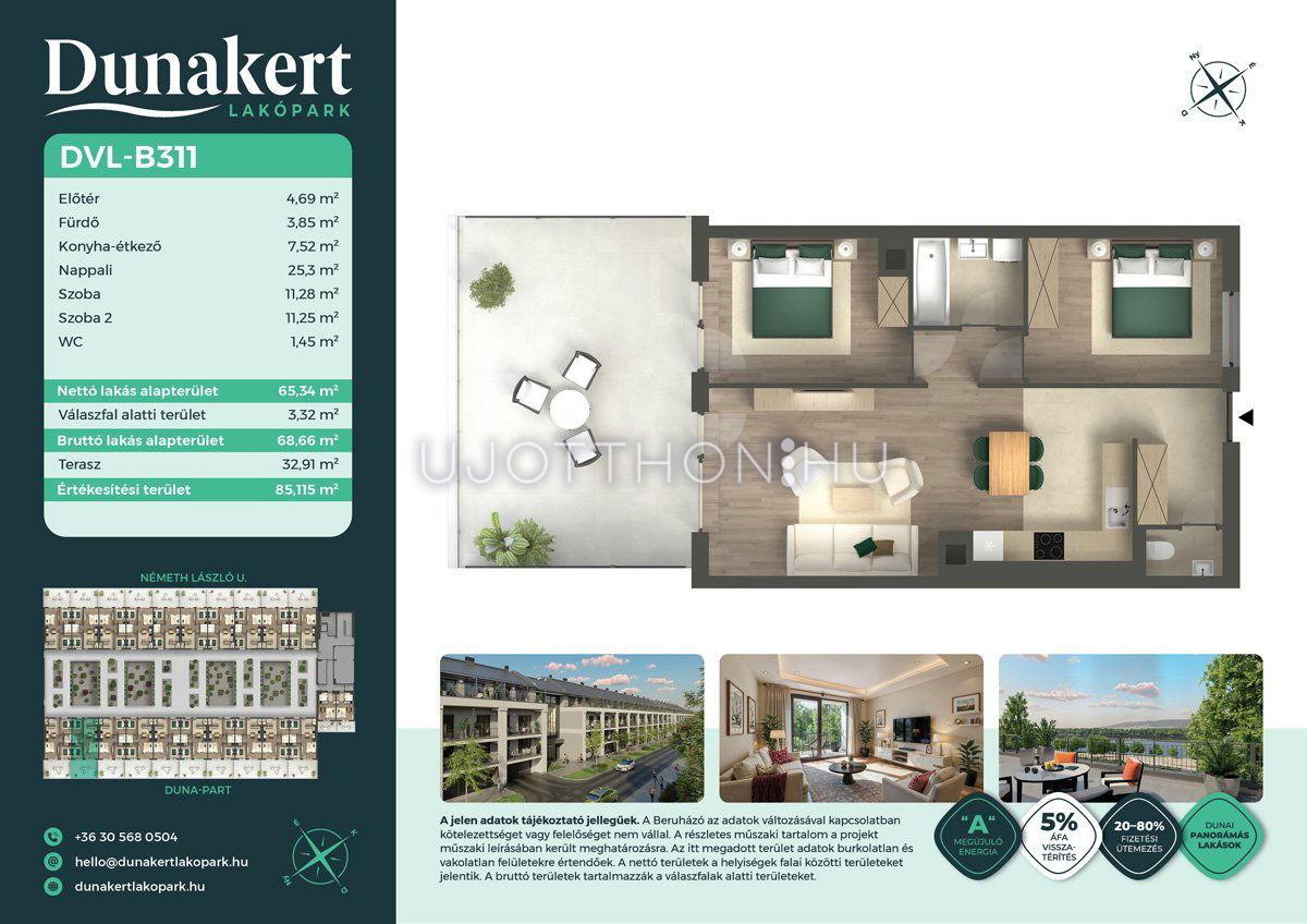 A Dunakert Lakópark Vác északi részén, a Németh László utcában épül, egy csendes, rendezett városrészben, közvetlenül a Duna-part mellett. A négyszintes épületben 152 modern, energiahatékony lakás kap helyet. A praktikus stúdióktól a nappali + több hálószobás családi otthonokig. Az emeleti lakásokhoz tágas terasz, a földszintiekhez saját kert tartozik, így minden lakó számára biztosított a privát kültéri tér és a természetkapcsolat.