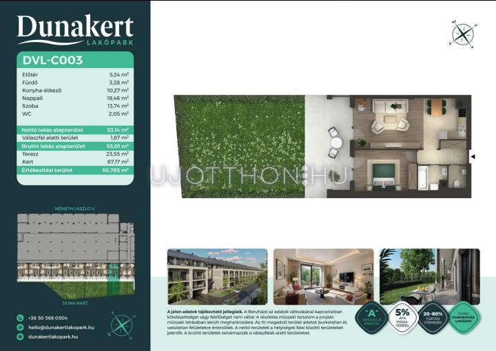 A Dunakert Lakópark Vác északi részén, a Németh László utcában épül, egy csendes, rendezett városrészben, közvetlenül a Duna-part mellett. A négyszintes épületben 152 modern, energiahatékony lakás kap helyet. A praktikus stúdióktól a nappali + több hálószobás családi otthonokig. Az emeleti lakásokhoz tágas terasz, a földszintiekhez saját kert tartozik, így minden lakó számára biztosított a privát kültéri tér és a természetkapcsolat.