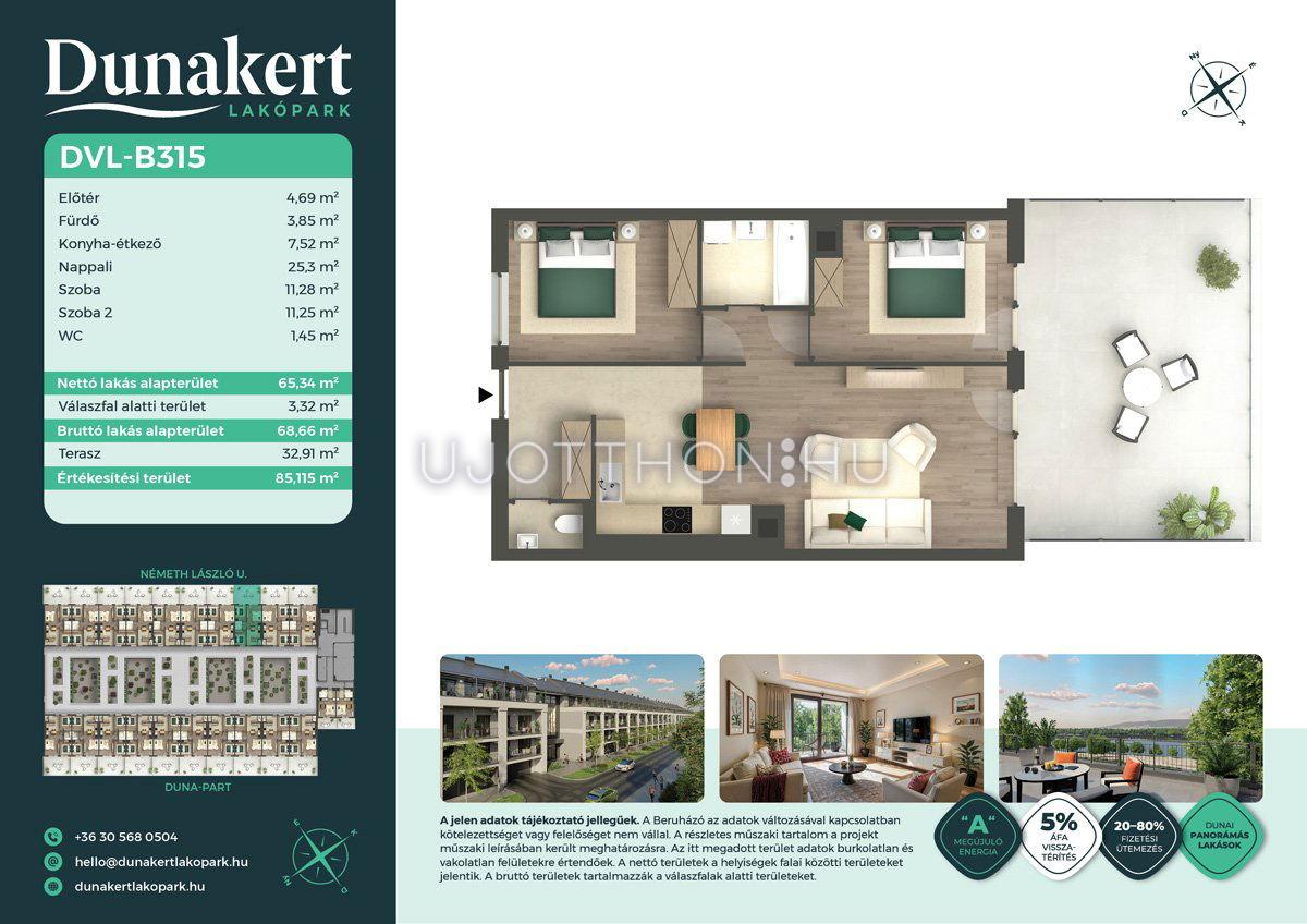 A Dunakert Lakópark Vác északi részén, a Németh László utcában épül, egy csendes, rendezett városrészben, közvetlenül a Duna-part mellett. A négyszintes épületben 152 modern, energiahatékony lakás kap helyet. A praktikus stúdióktól a nappali + több hálószobás családi otthonokig. Az emeleti lakásokhoz tágas terasz, a földszintiekhez saját kert tartozik, így minden lakó számára biztosított a privát kültéri tér és a természetkapcsolat.