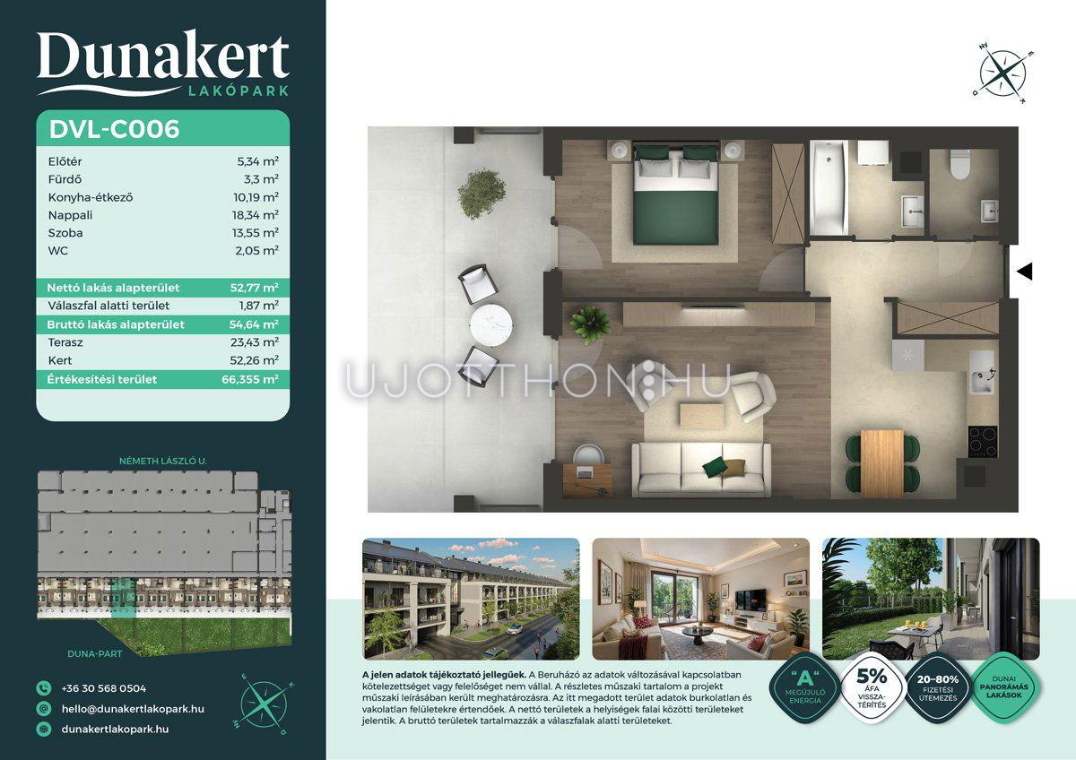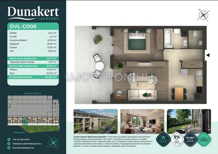 A Dunakert Lakópark Vác északi részén, a Németh László utcában épül, egy csendes, rendezett városrészben, közvetlenül a Duna-part mellett. A négyszintes épületben 152 modern, energiahatékony lakás kap helyet. A praktikus stúdióktól a nappali + több hálószobás családi otthonokig. Az emeleti lakásokhoz tágas terasz, a földszintiekhez saját kert tartozik, így minden lakó számára biztosított a privát kültéri tér és a természetkapcsolat.
