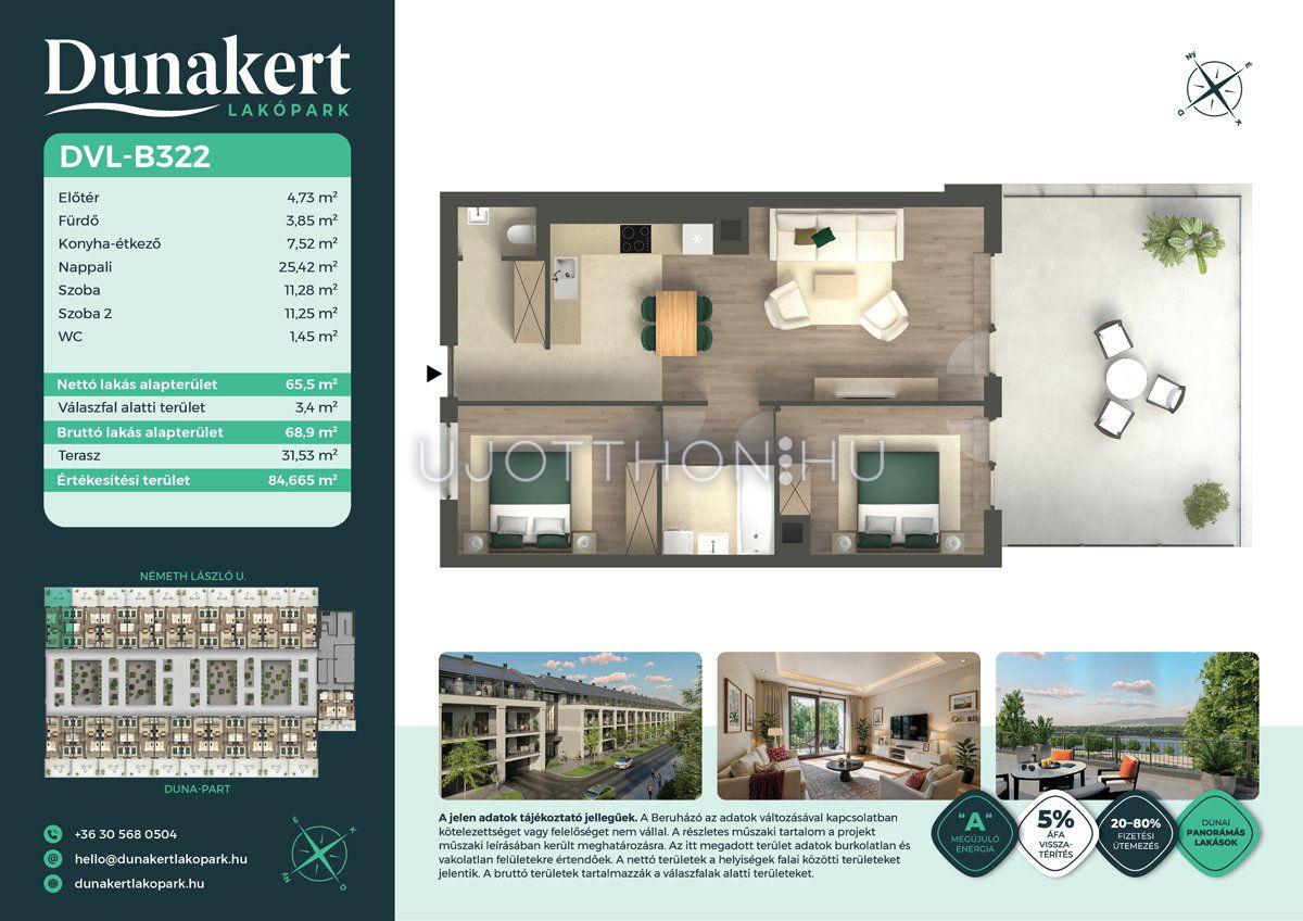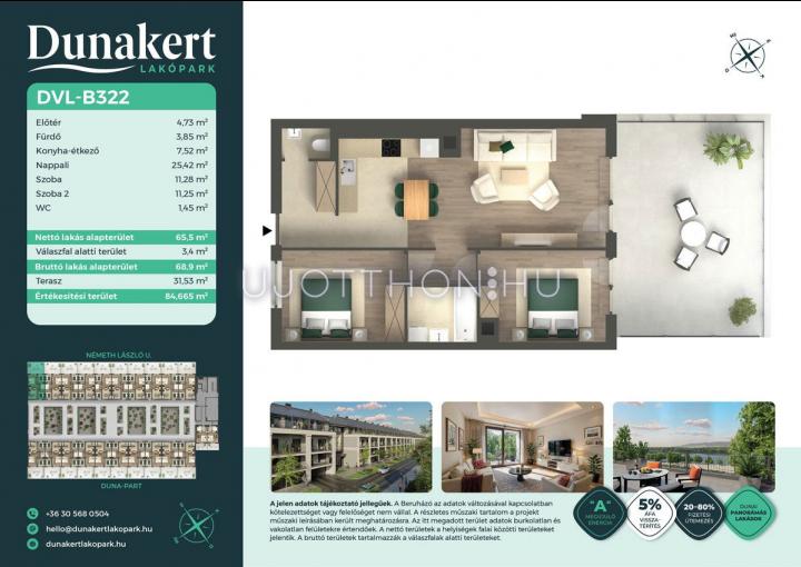 A Dunakert Lakópark Vác északi részén, a Németh László utcában épül, egy csendes, rendezett városrészben, közvetlenül a Duna-part mellett. A négyszintes épületben 152 modern, energiahatékony lakás kap helyet. A praktikus stúdióktól a nappali + több hálószobás családi otthonokig. Az emeleti lakásokhoz tágas terasz, a földszintiekhez saját kert tartozik, így minden lakó számára biztosított a privát kültéri tér és a természetkapcsolat.