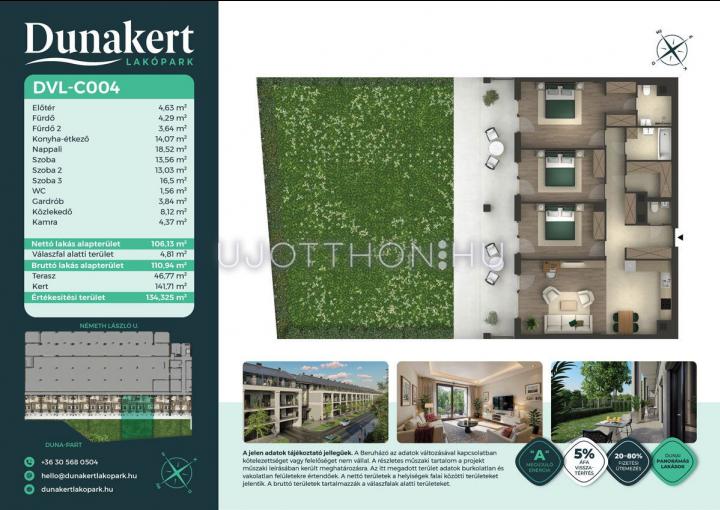 A Dunakert Lakópark Vác északi részén, a Németh László utcában épül, egy csendes, rendezett városrészben, közvetlenül a Duna-part mellett. A négyszintes épületben 152 modern, energiahatékony lakás kap helyet. A praktikus stúdióktól a nappali + több hálószobás családi otthonokig. Az emeleti lakásokhoz tágas terasz, a földszintiekhez saját kert tartozik, így minden lakó számára biztosított a privát kültéri tér és a természetkapcsolat.