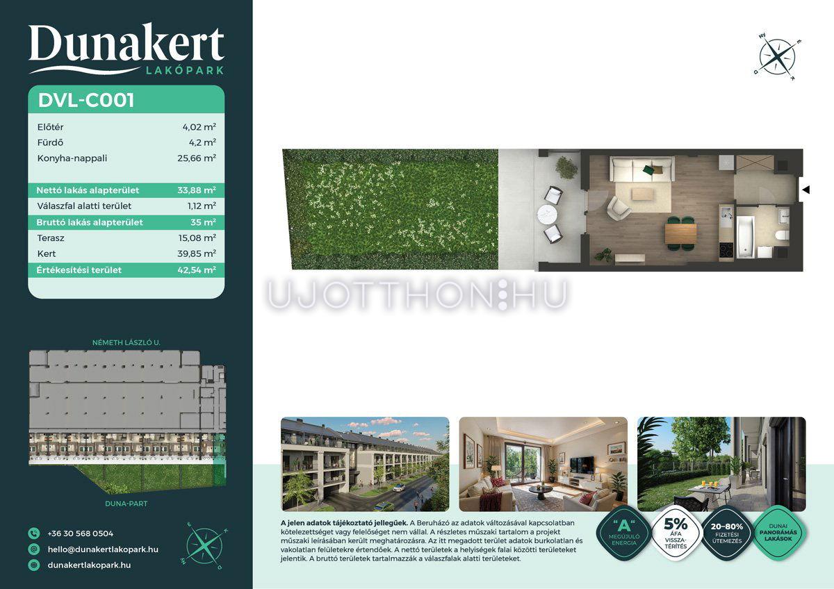 A Dunakert Lakópark Vác északi részén, a Németh László utcában épül, egy csendes, rendezett városrészben, közvetlenül a Duna-part mellett. A négyszintes épületben 152 modern, energiahatékony lakás kap helyet. A praktikus stúdióktól a nappali + több hálószobás családi otthonokig. Az emeleti lakásokhoz tágas terasz, a földszintiekhez saját kert tartozik, így minden lakó számára biztosított a privát kültéri tér és a természetkapcsolat.