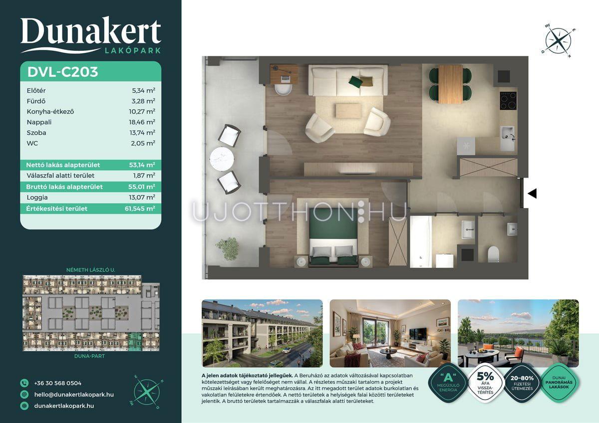A Dunakert Lakópark Vác északi részén, a Németh László utcában épül, egy csendes, rendezett városrészben, közvetlenül a Duna-part mellett. A négyszintes épületben 152 modern, energiahatékony lakás kap helyet. A praktikus stúdióktól a nappali + több hálószobás családi otthonokig. Az emeleti lakásokhoz tágas terasz, a földszintiekhez saját kert tartozik, így minden lakó számára biztosított a privát kültéri tér és a természetkapcsolat.