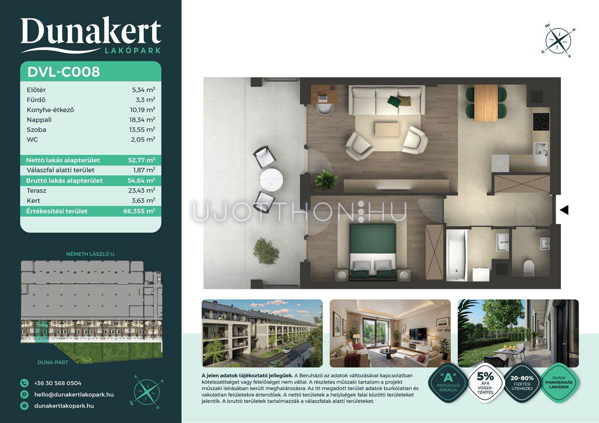 A Dunakert Lakópark Vác északi részén, a Németh László utcában épül, egy csendes, rendezett városrészben, közvetlenül a Duna-part mellett. A négyszintes épületben 152 modern, energiahatékony lakás kap helyet. A praktikus stúdióktól a nappali + több hálószobás családi otthonokig. Az emeleti lakásokhoz tágas terasz, a földszintiekhez saját kert tartozik, így minden lakó számára biztosított a privát kültéri tér és a természetkapcsolat.