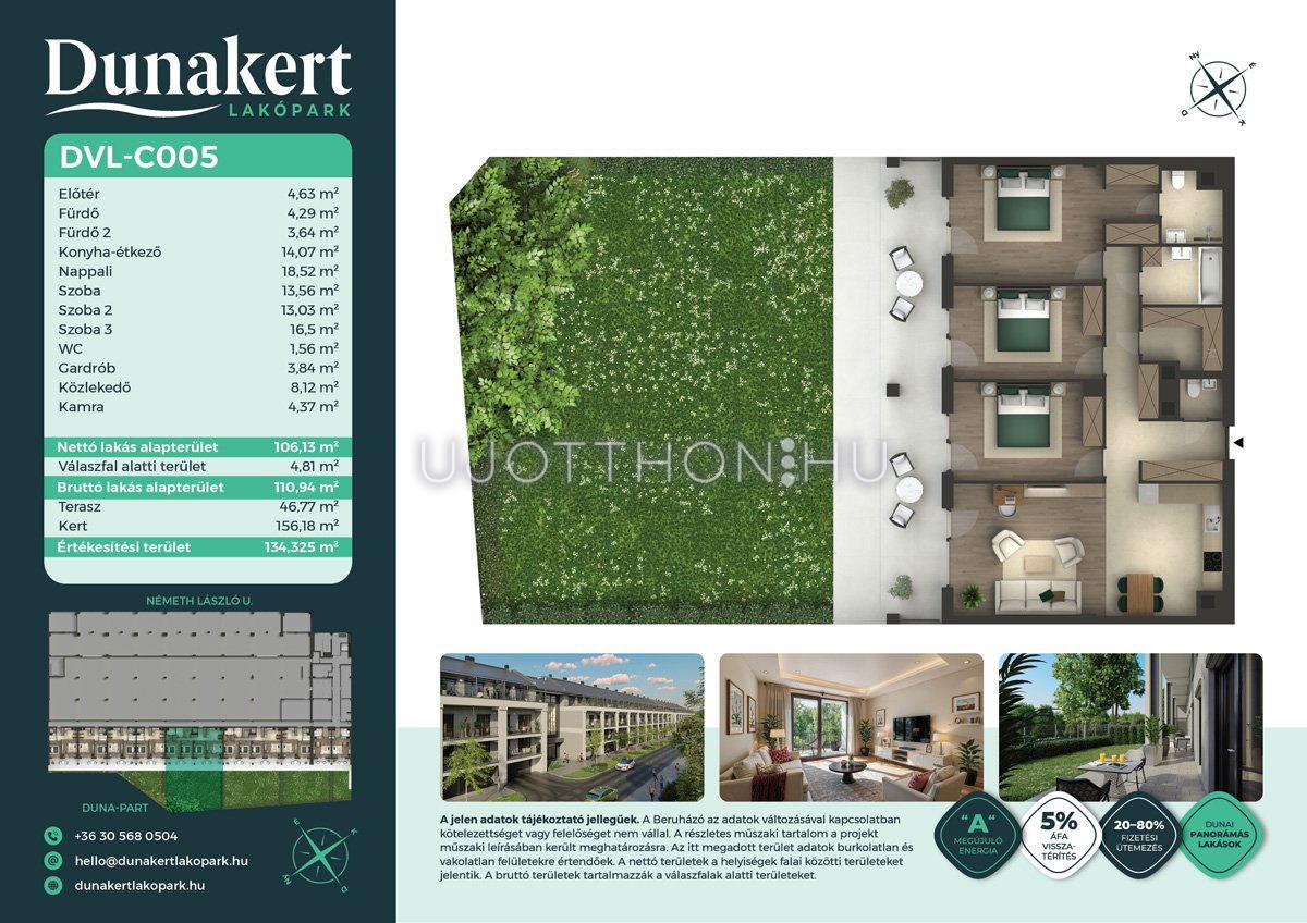 A Dunakert Lakópark Vác északi részén, a Németh László utcában épül, egy csendes, rendezett városrészben, közvetlenül a Duna-part mellett. A négyszintes épületben 152 modern, energiahatékony lakás kap helyet. A praktikus stúdióktól a nappali + több hálószobás családi otthonokig. Az emeleti lakásokhoz tágas terasz, a földszintiekhez saját kert tartozik, így minden lakó számára biztosított a privát kültéri tér és a természetkapcsolat.