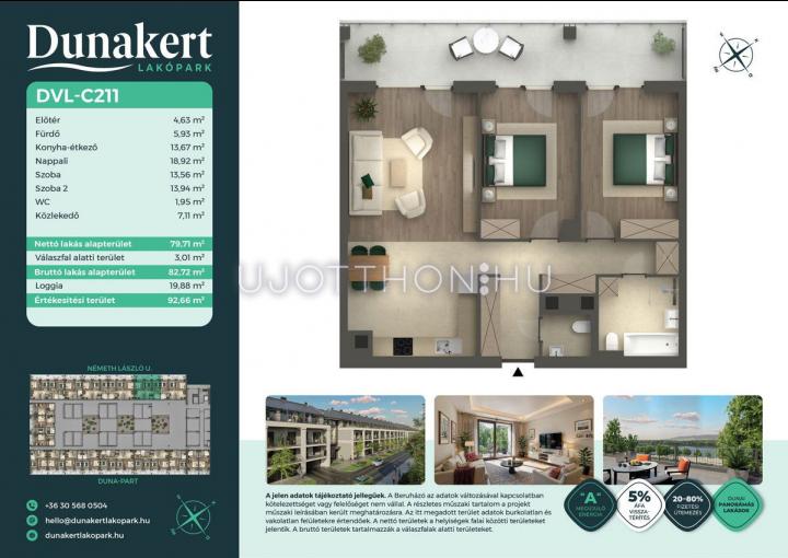 A Dunakert Lakópark Vác északi részén, a Németh László utcában épül, egy csendes, rendezett városrészben, közvetlenül a Duna-part mellett. A négyszintes épületben 152 modern, energiahatékony lakás kap helyet. A praktikus stúdióktól a nappali + több hálószobás családi otthonokig. Az emeleti lakásokhoz tágas terasz, a földszintiekhez saját kert tartozik, így minden lakó számára biztosított a privát kültéri tér és a természetkapcsolat.
