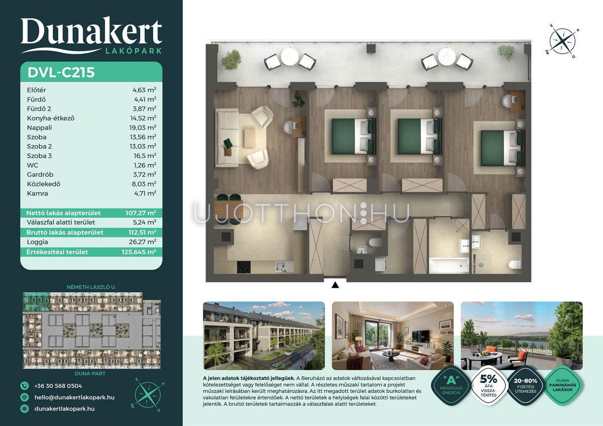 A Dunakert Lakópark Vác északi részén, a Németh László utcában épül, egy csendes, rendezett városrészben, közvetlenül a Duna-part mellett. A négyszintes épületben 152 modern, energiahatékony lakás kap helyet. A praktikus stúdióktól a nappali + több hálószobás családi otthonokig. Az emeleti lakásokhoz tágas terasz, a földszintiekhez saját kert tartozik, így minden lakó számára biztosított a privát kültéri tér és a természetkapcsolat.