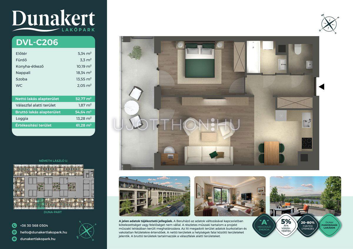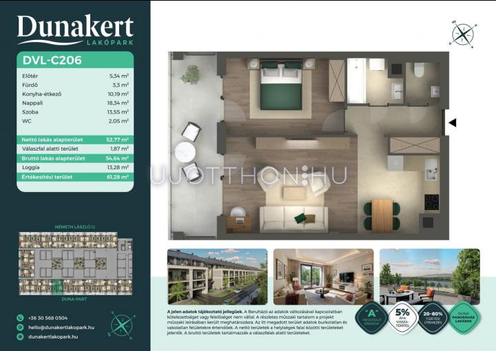 A Dunakert Lakópark Vác északi részén, a Németh László utcában épül, egy csendes, rendezett városrészben, közvetlenül a Duna-part mellett. A négyszintes épületben 152 modern, energiahatékony lakás kap helyet. A praktikus stúdióktól a nappali + több hálószobás családi otthonokig. Az emeleti lakásokhoz tágas terasz, a földszintiekhez saját kert tartozik, így minden lakó számára biztosított a privát kültéri tér és a természetkapcsolat.