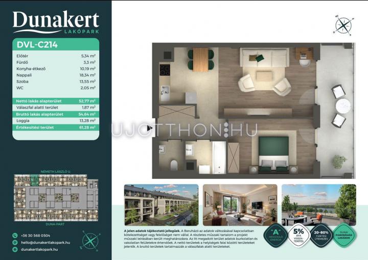 A Dunakert Lakópark Vác északi részén, a Németh László utcában épül, egy csendes, rendezett városrészben, közvetlenül a Duna-part mellett. A négyszintes épületben 152 modern, energiahatékony lakás kap helyet. A praktikus stúdióktól a nappali + több hálószobás családi otthonokig. Az emeleti lakásokhoz tágas terasz, a földszintiekhez saját kert tartozik, így minden lakó számára biztosított a privát kültéri tér és a természetkapcsolat.