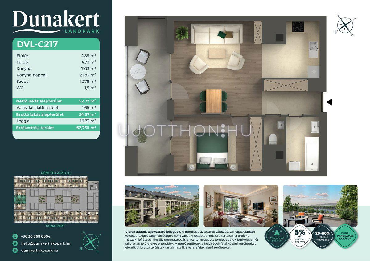 A Dunakert Lakópark Vác északi részén, a Németh László utcában épül, egy csendes, rendezett városrészben, közvetlenül a Duna-part mellett. A négyszintes épületben 152 modern, energiahatékony lakás kap helyet. A praktikus stúdióktól a nappali + több hálószobás családi otthonokig. Az emeleti lakásokhoz tágas terasz, a földszintiekhez saját kert tartozik, így minden lakó számára biztosított a privát kültéri tér és a természetkapcsolat.