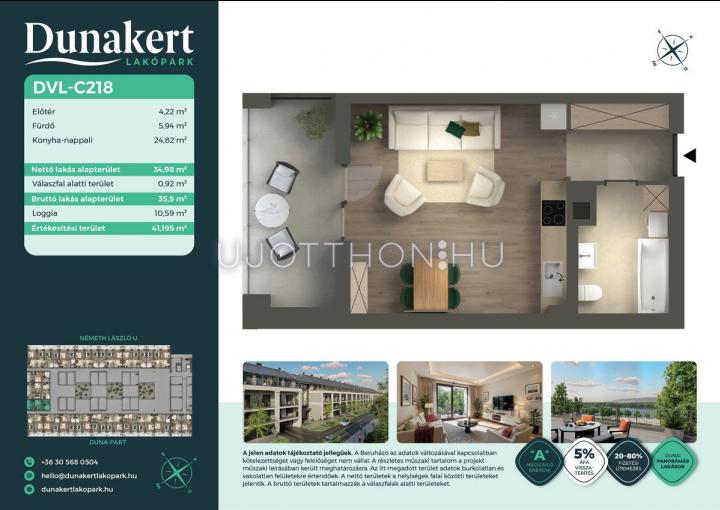 A Dunakert Lakópark Vác északi részén, a Németh László utcában épül, egy csendes, rendezett városrészben, közvetlenül a Duna-part mellett. A négyszintes épületben 152 modern, energiahatékony lakás kap helyet. A praktikus stúdióktól a nappali + több hálószobás családi otthonokig. Az emeleti lakásokhoz tágas terasz, a földszintiekhez saját kert tartozik, így minden lakó számára biztosított a privát kültéri tér és a természetkapcsolat.
