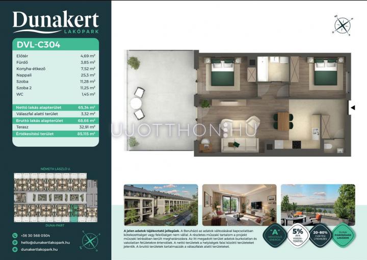 A Dunakert Lakópark Vác északi részén, a Németh László utcában épül, egy csendes, rendezett városrészben, közvetlenül a Duna-part mellett. A négyszintes épületben 152 modern, energiahatékony lakás kap helyet. A praktikus stúdióktól a nappali + több hálószobás családi otthonokig. Az emeleti lakásokhoz tágas terasz, a földszintiekhez saját kert tartozik, így minden lakó számára biztosított a privát kültéri tér és a természetkapcsolat.