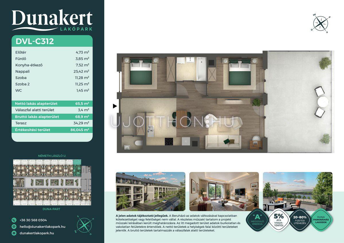 A Dunakert Lakópark Vác északi részén, a Németh László utcában épül, egy csendes, rendezett városrészben, közvetlenül a Duna-part mellett. A négyszintes épületben 152 modern, energiahatékony lakás kap helyet. A praktikus stúdióktól a nappali + több hálószobás családi otthonokig. Az emeleti lakásokhoz tágas terasz, a földszintiekhez saját kert tartozik, így minden lakó számára biztosított a privát kültéri tér és a természetkapcsolat.